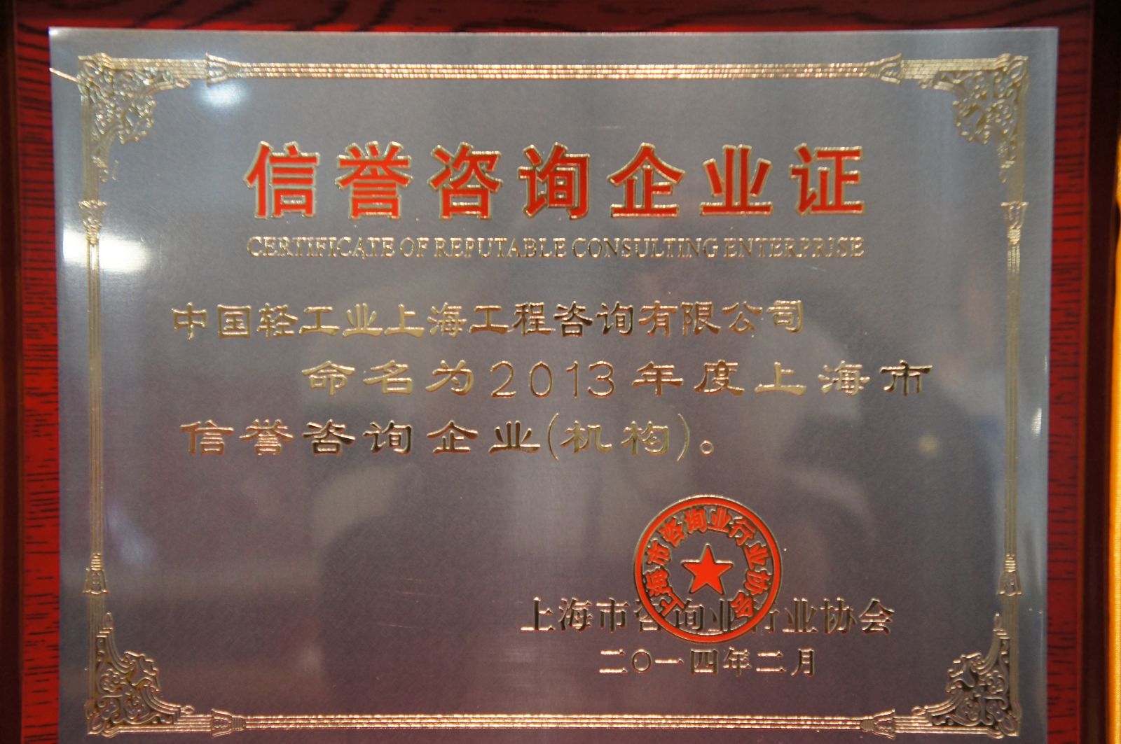 公司荣获2013年度第十届上海市信誉咨询企业荣誉称号