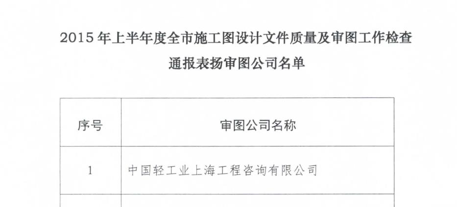 近日,上海市建设工程设计文件审查管理事务中心印发沪设审发[2015] 44号文,我司在2015年上半年度上海市施工图审图单位行为质量检查中,被予以通报表扬,公司将一如既往为本市审查质量、维护建设工程质量安全做出贡献。