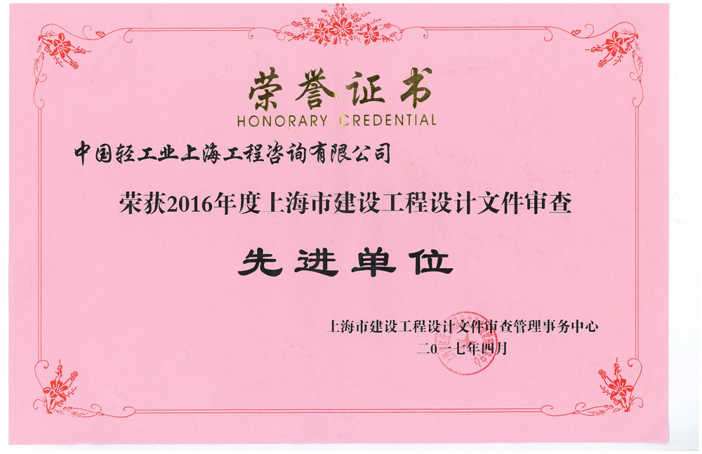 公司2016年度再次荣获“上海市建设工程设计文件审查先进单位”