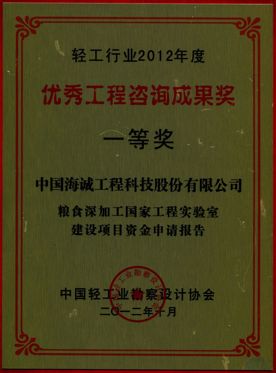 近日,经中国轻工业勘察设计协会的评定,公司编写的“粮食深加工国家工程实验室建设项目资金申请报告”获得轻工行业2012年度优秀工程咨询成果奖一等奖。